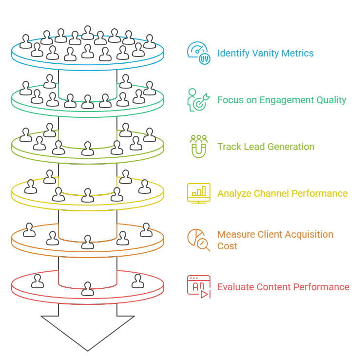 The metrics that actually matter are lead generation metrics. How many qualified inquiries are you getting? Where are they coming from? What’s the conversion rate from inquiry to client? These numbers directly connect to revenue.