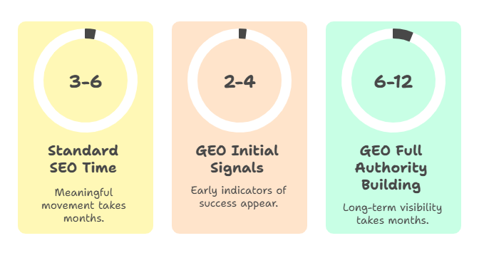 This is the question every business owner asks, and the honest answer is: longer than most digital marketing channels, but with far more durable results. Traditional paid advertising delivers immediate traffic but stops the moment you pause spending. Standard SEO takes three to six months to show meaningful movement. GEO sits somewhere in between, with initial signals appearing in two to four months but full authority building over six to twelve months.