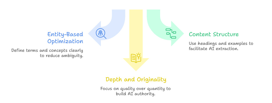 First, entity-based optimization matters more than keywords. Define every term, concept, and service explicitly. Don’t assume the reader or the AI knows what you mean by “conversion optimization” or “short-form video strategy.” Explain it clearly, connect it to related concepts, and structure your definitions so they can stand alone as citeable facts. AI engines prioritize content that reduces ambiguity.
